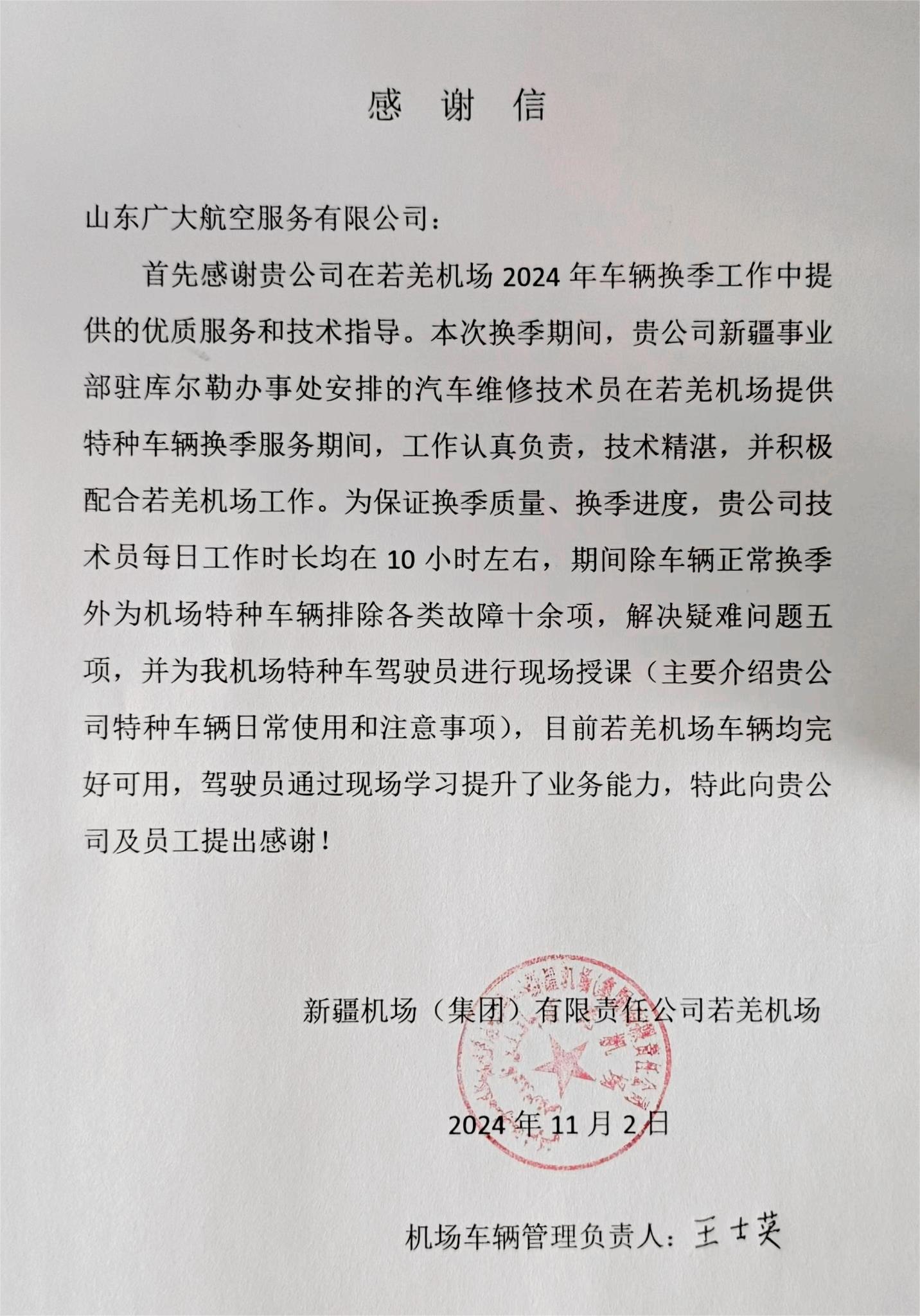 近日,新疆機(jī)場(chǎng)(集團(tuán))有限責(zé)任公司若羌機(jī)場(chǎng)向山東廣大航空服務(wù)有限公司(以下簡(jiǎn)稱“廣大航服”)致感謝信,對(duì)其在2024年車輛換季工作中提供的優(yōu)質(zhì)服務(wù)和技術(shù)指導(dǎo)表示誠(chéng)摯的感謝。若羌機(jī)場(chǎng)在感謝信中提到,廣大航服的汽車維修技術(shù)員在換季期間表現(xiàn)出色,以專業(yè)技能和敬業(yè)精神為若羌…